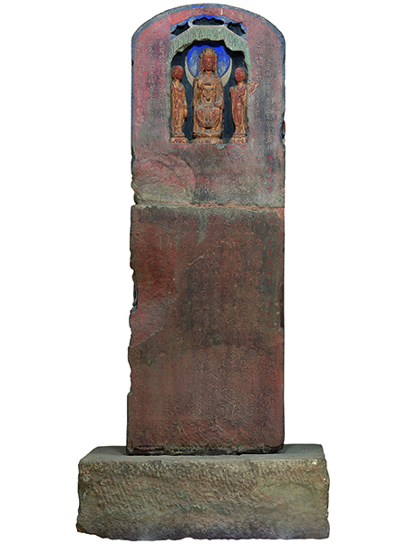 甘肃境内的造像碑始于北魏时期,其后造像碑体量逐渐增大,内容也更加丰富起来。这件隋代造像碑从上到下大致可分为四层,上方是释迦多宝二佛并坐,两侧各有一佛二弟子小龛。其下为一佛二菩萨,再下为弥勒倚坐像与二弟子,两侧各有一佛二弟子小龛。最下层区间内刻文殊与维摩诘对坐说法。这些题材常见于北朝至隋的造像碑上。此碑在人物的组合排布上显得十分成熟,虽人物众多,仍被安排地有条不紊,如维摩诘像,坐于帐中,身后有几位立姿的人物,虽空间狭小,仍能将人物的前后主次关系表达清楚。造像碑左右两侧各开四龛,均为一佛二弟子像。碑阴上部正中设弥勒菩萨龛像,碑身刻发愿文与供养人题名,发愿文中提到:“维开皇元年岁辛丑四月庚辰朔廿三日壬寅,佛弟子李阿昌等廿家去岁之秋合为仲契……”,可知此碑为开皇元年,由李阿昌等二十家结社所造。