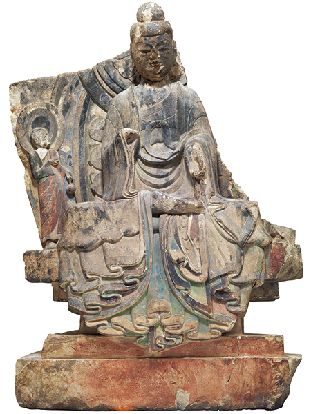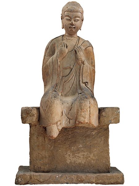 麦积山石窟开凿于陡峭的崖壁上,自后秦、西秦,又经北魏、西魏、隋、唐,至宋、元、明、清各时代均有营建。这尊坐像原为麦积山西崖第117窟的主尊,头部略方,高肉髻,饱满的脸颊,目光俯视。西魏造像继承了北魏造像传统,人物仍具有秀骨清像的特征,但人物身躯更为饱满,富有张力。佛像于须弥座上结跏趺坐,内着僧祇支,胸前束带,外披厚重的袈裟,衣褶垂搭于台座前,层层叠叠的处理富有韵律和节奏。左手施与愿印,右手残损。佛像身后有圆形头光和椭圆形身光,以莲瓣装饰。两侧的弟子像,残存右面一身,侧身面朝主尊,一手持净瓶,姿态恭谨。造像身上仍保留有当时的彩绘,得以一睹当时洞窟内的华彩。