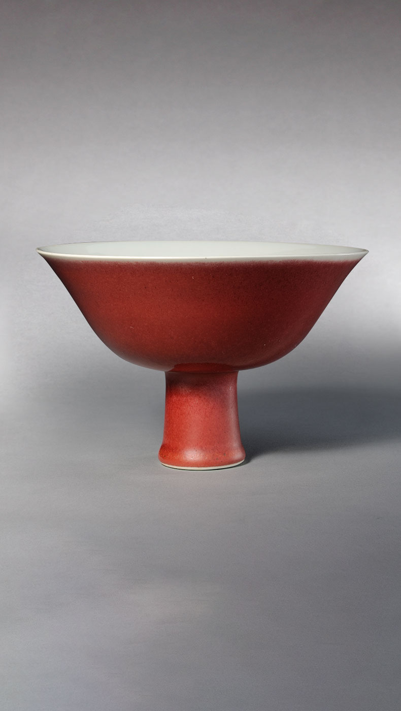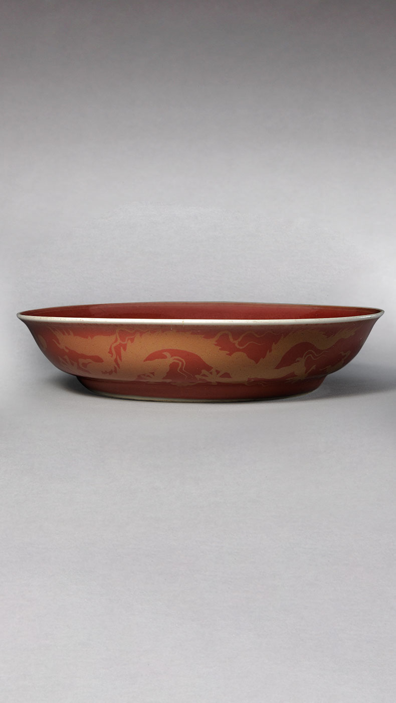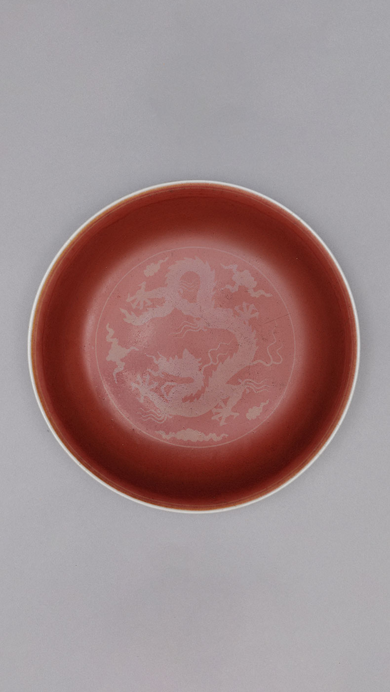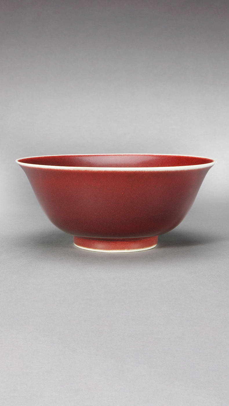 釉彩中的红色来自于呈色剂中的铜。自元代起,景德镇窑便尝试烧造鲜亮的红色瓷器。但铜红对于温度、气氛的要求非常敏感,稍有不慎就会偏暗、发绿甚至发黑,因此高温铜红釉是最难烧造的颜色。明初的永乐、宣德年间,纯正鲜艳、釉汁莹厚的鲜红釉瓷器集中了前代的工艺成果“横空出世”,被后人誉为名品。