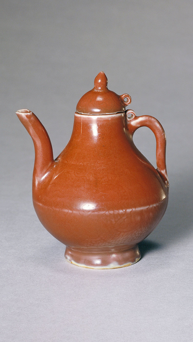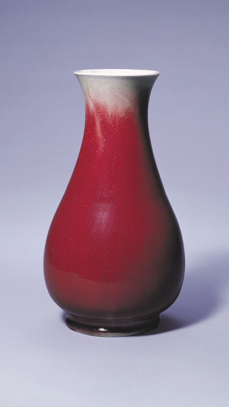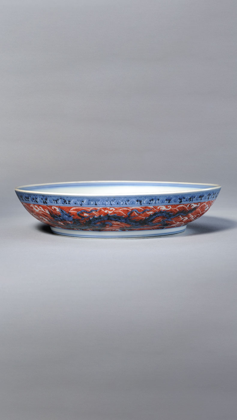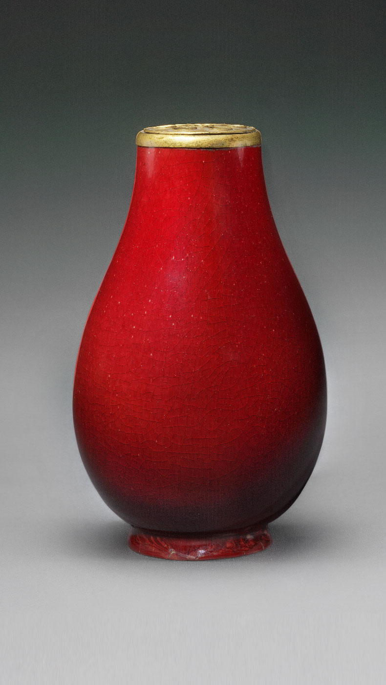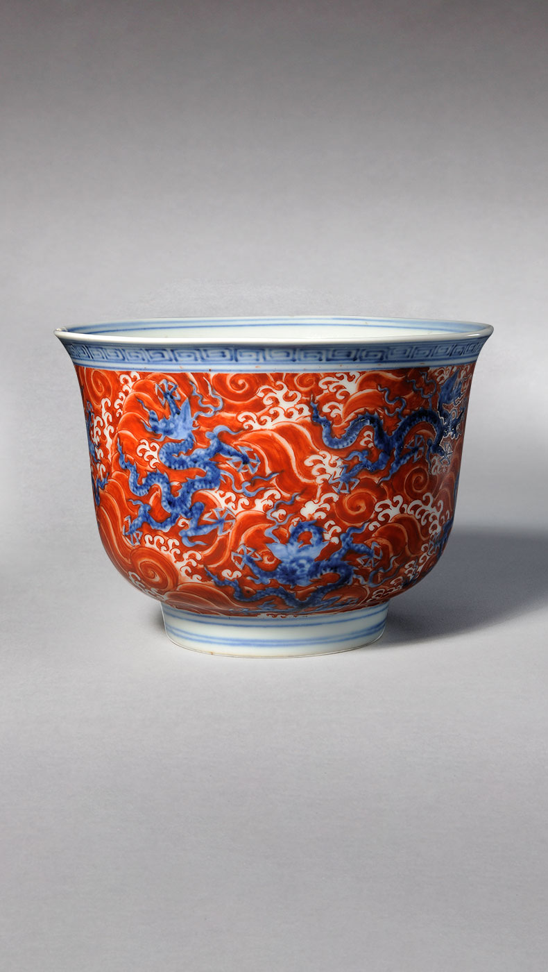 釉彩中的红色来自于呈色剂中的铜。自元代起,景德镇窑便尝试烧造鲜亮的红色瓷器。但铜红对于温度、气氛的要求非常敏感,稍有不慎就会偏暗、发绿甚至发黑,因此高温铜红釉是最难烧造的颜色。明初的永乐、宣德年间,纯正鲜艳、釉汁莹厚的鲜红釉瓷器集中了前代的工艺成果“横空出世”,被后人誉为名品。