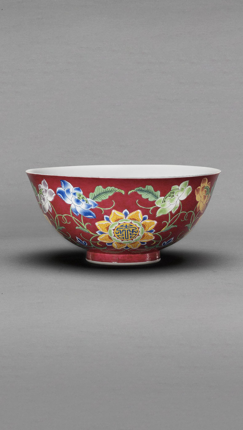 清 康熙御制款胭脂红地珐琅彩莲花团寿纹碗