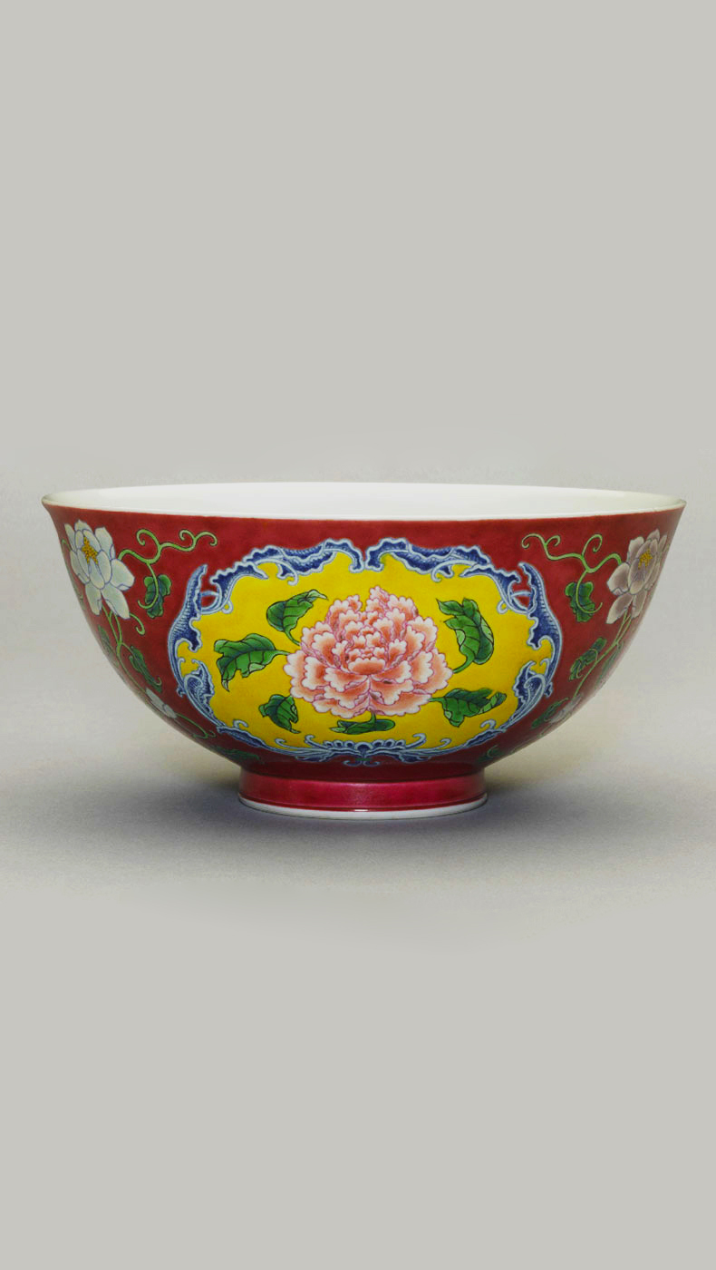 清 康熙御制款胭脂红地珐琅彩开光折枝牡丹图碗